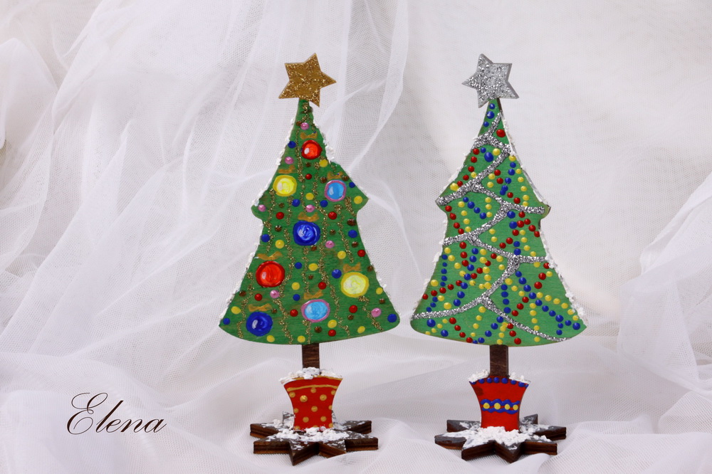 Две настольные сувенирные ёлочки, одна в серебре, другая в золоте, расписаны вручную яркими акриловыми красками.
