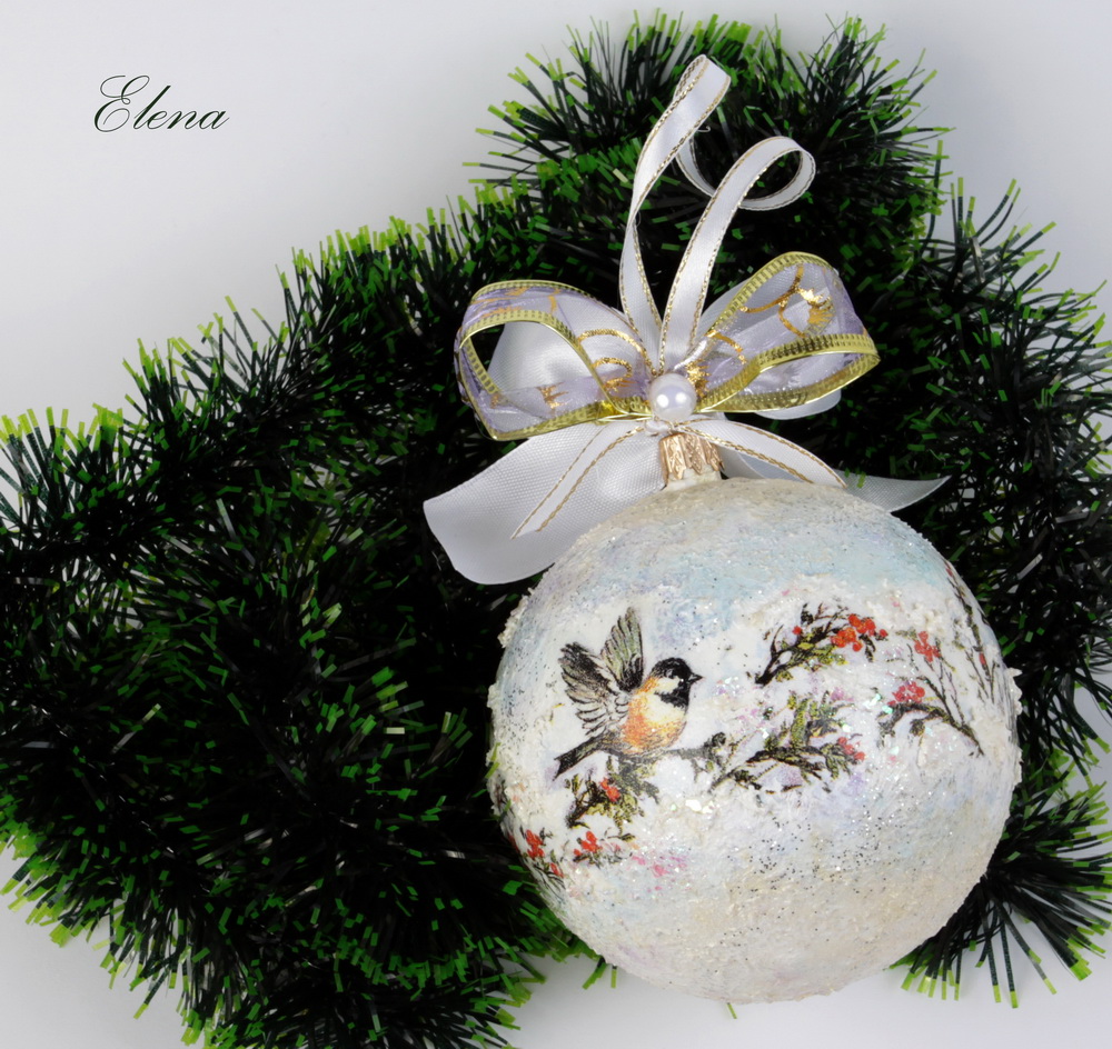 Ёлочное или интерьерное новогоднее украшение - шар c изображением птичек, украшенный бантиками.