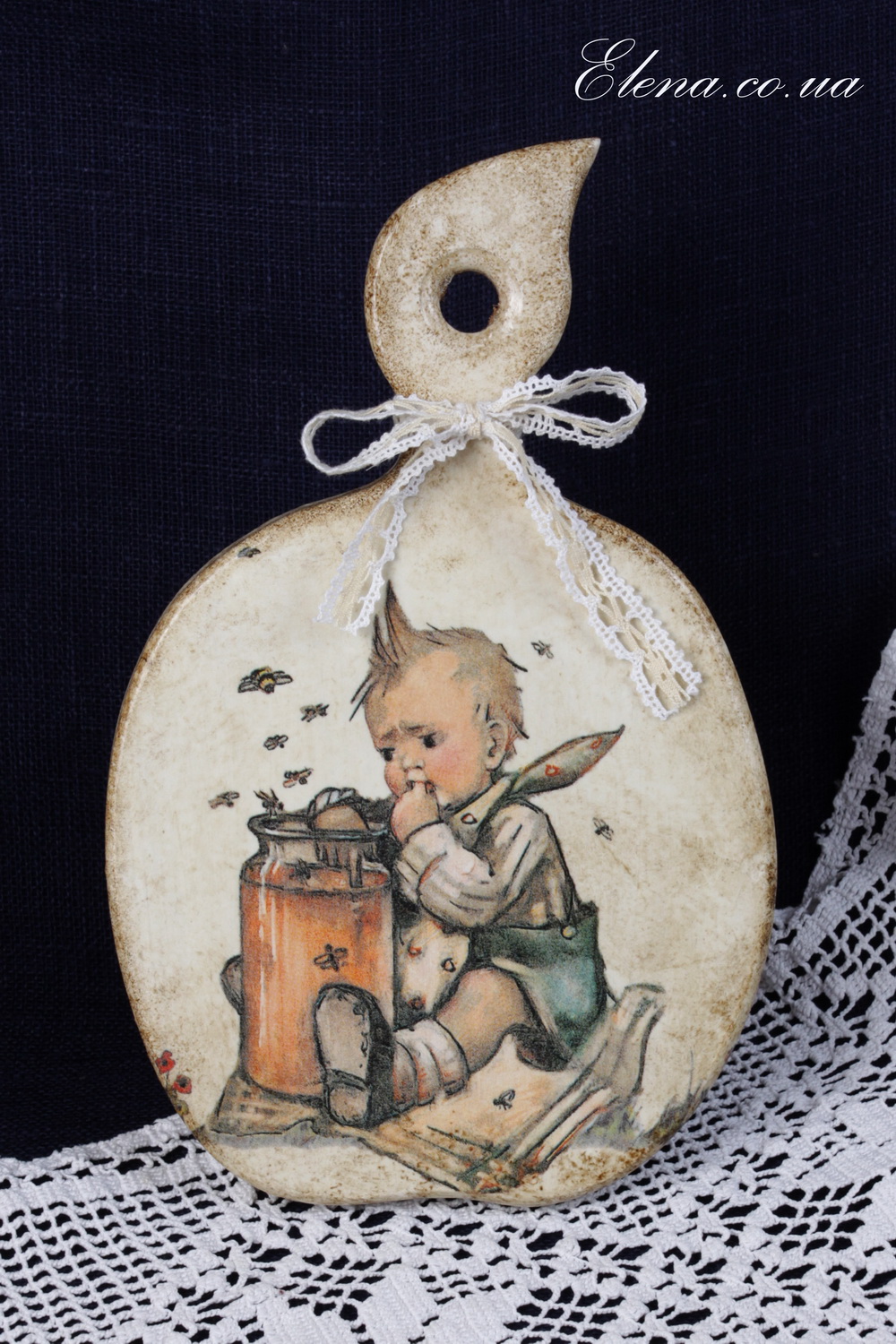 Доска с милым мальчиком, который очень любит мёд :) Сделана в стиле винтаж, искусственно состарена, украшена кружевом.