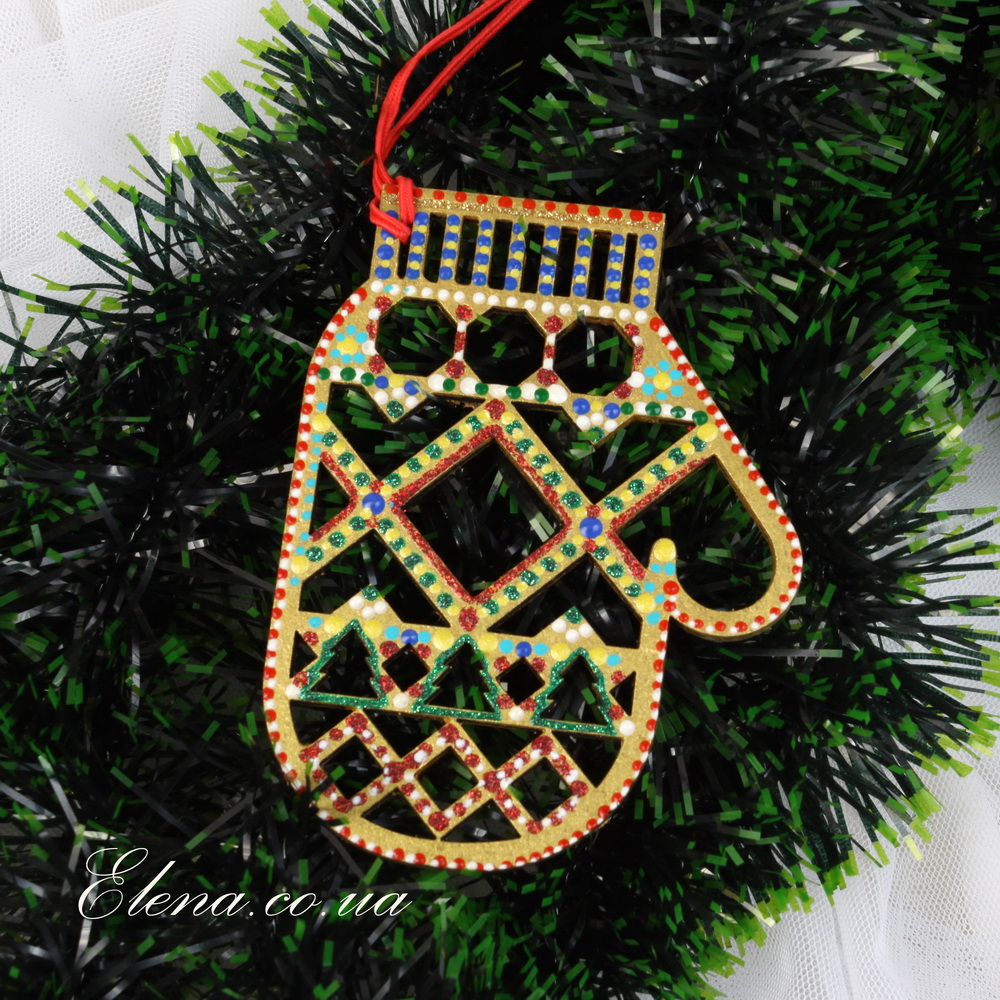 Украшение для ёлки - подвеска в форме рукавички с ажурно вырезанным рисунком и яркой точечной росписью.