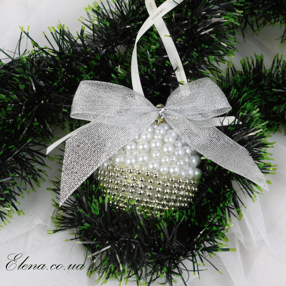 Шар сделан из небъющегося материала, украшен бантом, жемчужными и золотыми бусинами.