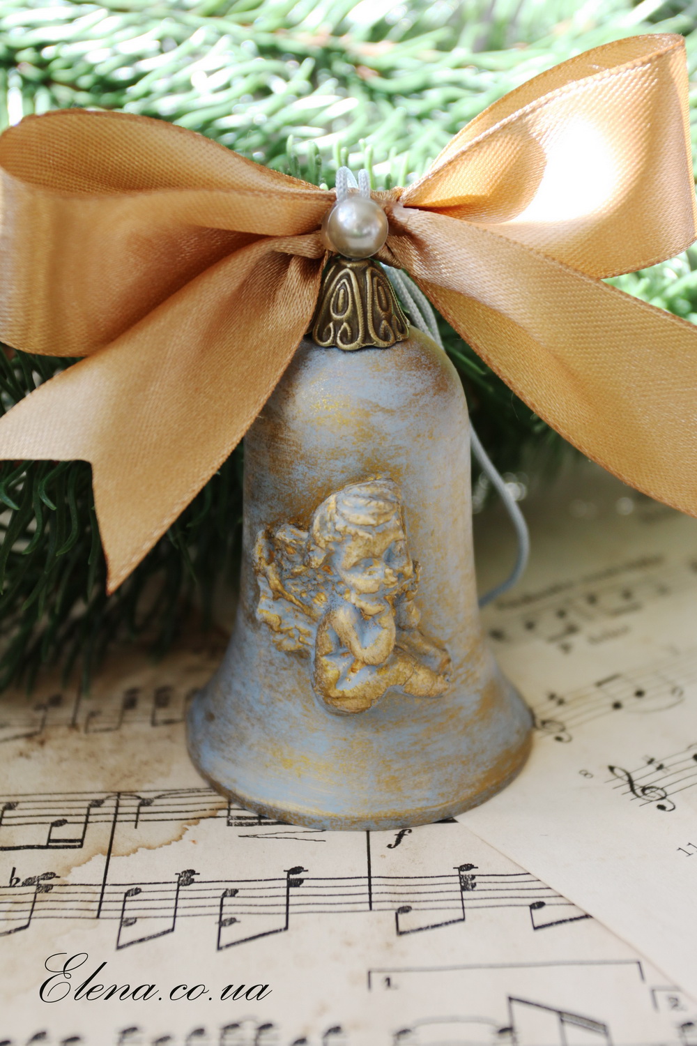 Искусственно состаренный колокольчик изготовлен из дерева. Не звенит, но постукивает. Украшен бантом и накладной фигуркой ангела. Замечательный новогодний подарок или украшение вашей ёлки.