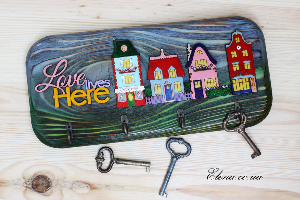 Настенная ключница с четырьмя крючками "Здесь живёт любовь..." - яркий акцент в интерьере.