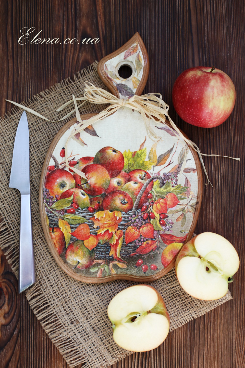 Яскрава дошка зроблена у формі яблука. З одного боку - картинка, яка буде прикрашати вашу кухню, з іншого боку можна нарізати харчові продукти.