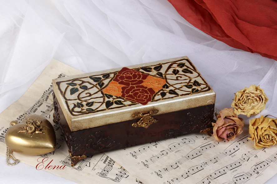 Шкатулка сделана из ольхи, декорирована в техниках имитаций эмали, резного дерева и "налёта времени". Внутри на донышке красный фетр.