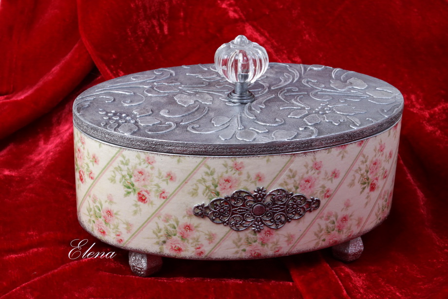 Выполнена в технике декупаж, имитация серебра на крышке. Внутри фетр нежно-розового цвета.