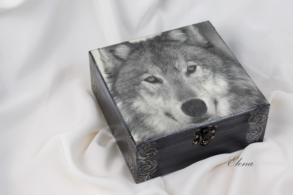 Выполнена в технике декупаж, имитация металла на углах, внутри окрашена, крышка на цепочке-ограничителе. Использованы экологичные материалы.
