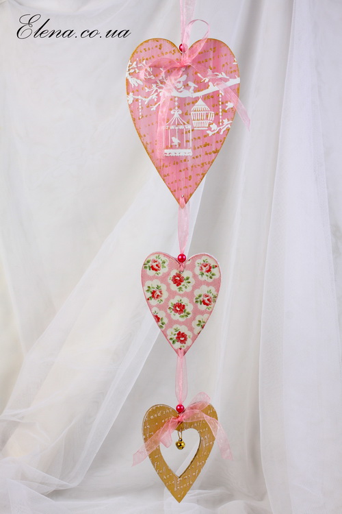 Интерьерное украшение - двухсторонняя подвеска в форме сердца, украшена кистью, тесьмой и бантами.