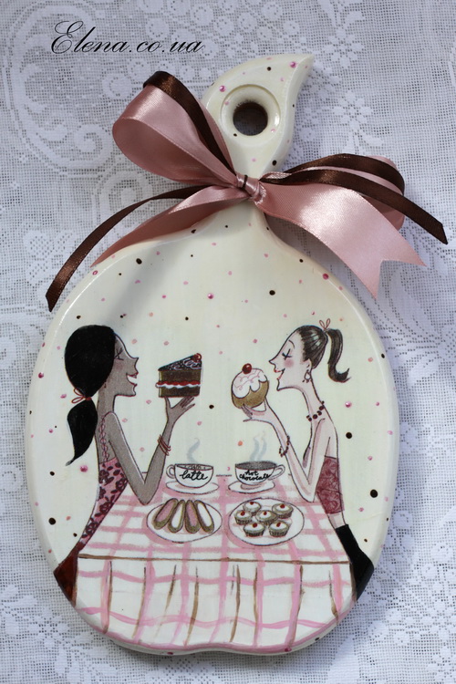 Кухонная доска-панно с весёлыми подружками, украшена бантиком.