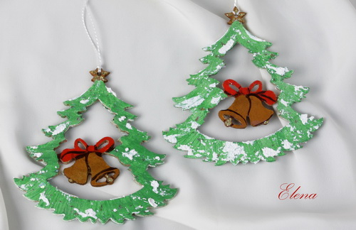 Фигурно вырезанные новогодние украшения в виде заснеженной ёлки с колокольчиком внутри.