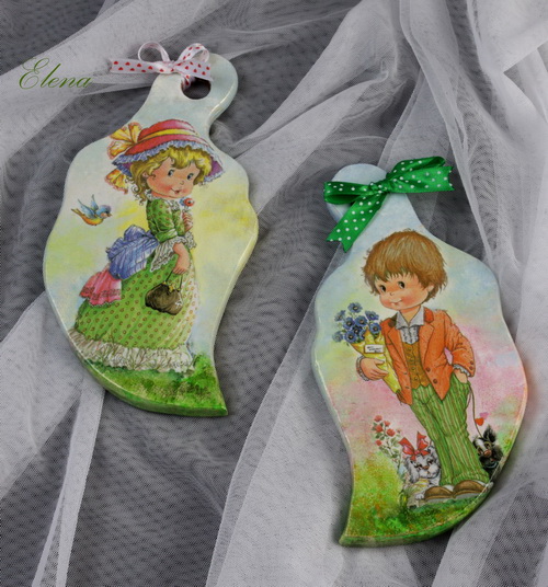 Пара милых деток на фигурных дощечках. Украшены кокетливыми бантиками. На обратной стороне доски нет рисунка, можно резать продукты. Или просто повесить на стенку как панно.