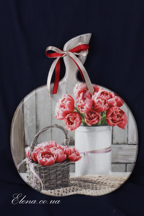 Деревянная доска в форме яблока с изображением ярких пионов может быть использована для нарезки продуктов, в остальное время будет просто украшать вашу кухню.