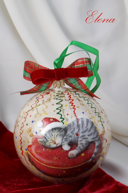 Симпатичный шар - украшение на ёлочку с милым котиком в новогодней шапочке.