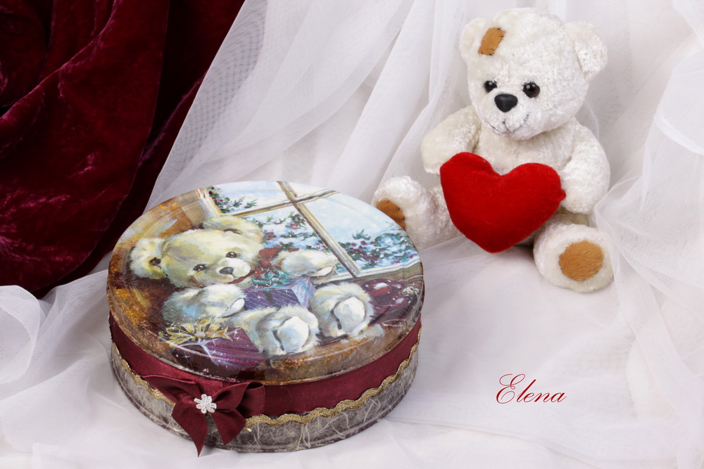 Коробка для упаковки сладкого подарка под ёлочку с изображением медвежонка, украшена лентами и золотистой тесьмой.