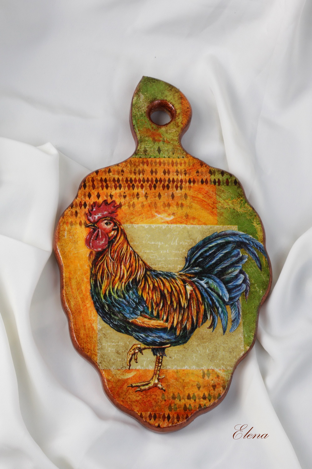 Яркий петушок, символ 2017 года, на фигурной доске из бука. Добавьте ярких красок на вашей кухне!