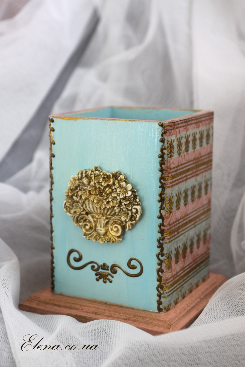 Размеры ориентировочно 8*8*10 см, материал - фанера, декоративная накладка - гипс.