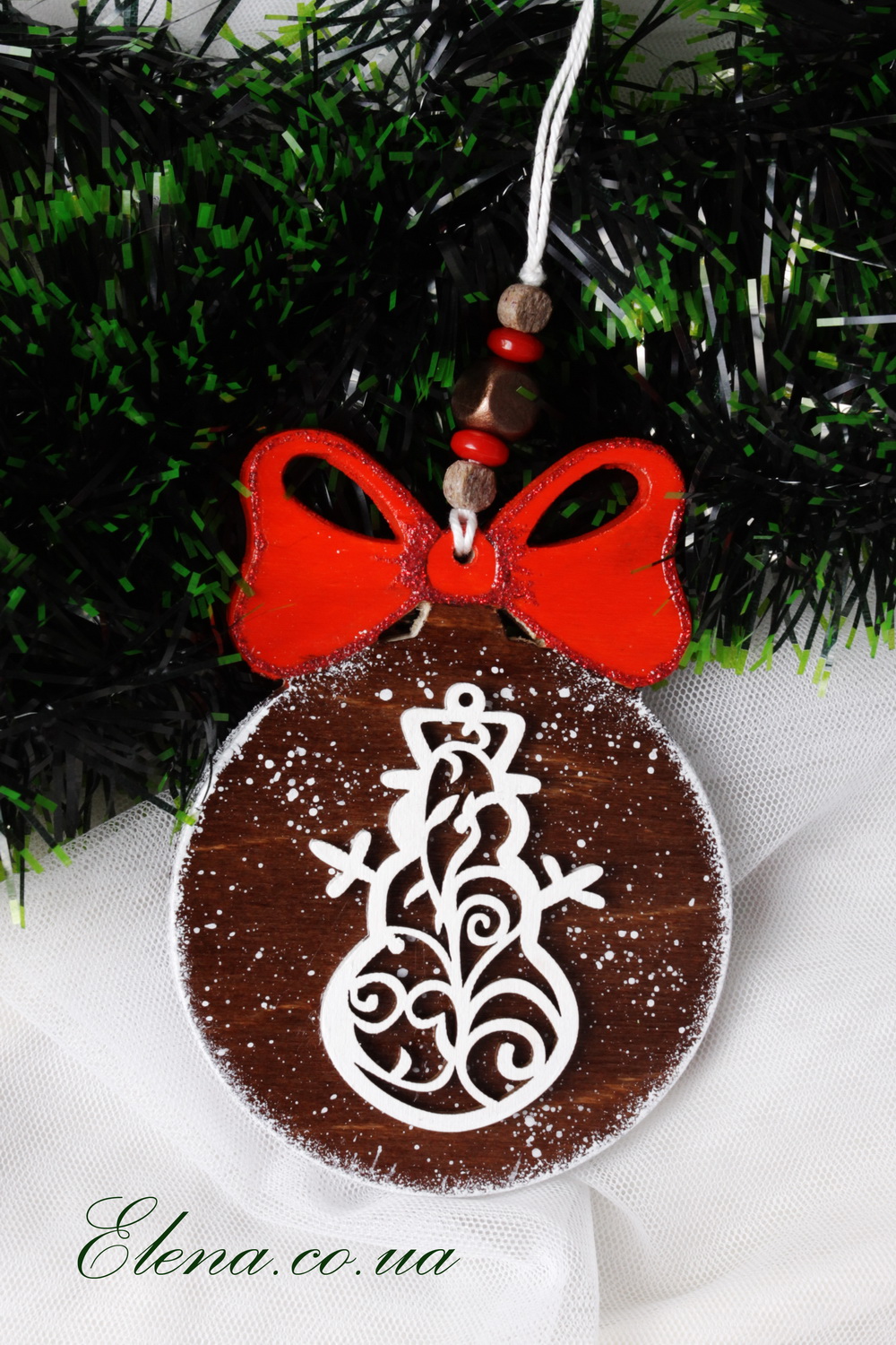 Ёлочная игрушка - подвеска в виде шарика с бантиком, украшена объёмной ажурной фигуркой снеговика и бусинками.