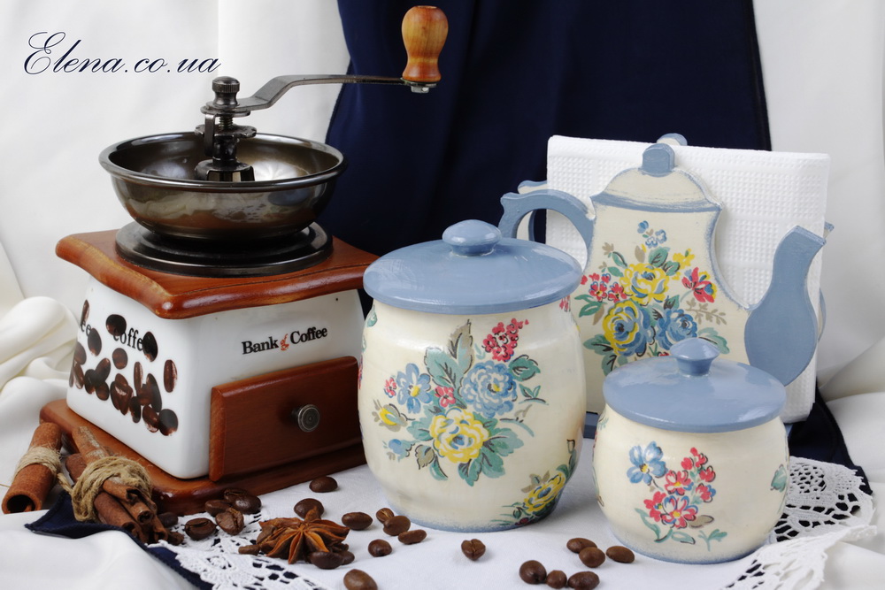 Красивые и нужные кухонные принадлежности выполнены в едином стиле.