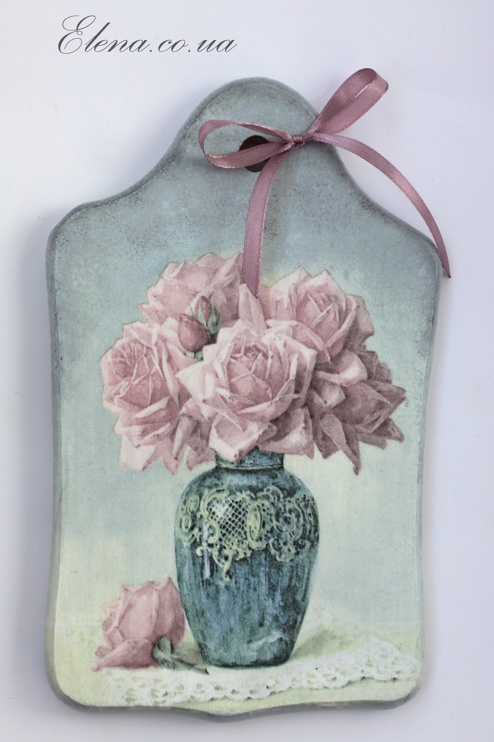 Небольшая кухонная дощечка с изображением букета нежных роз в старинной вазе.