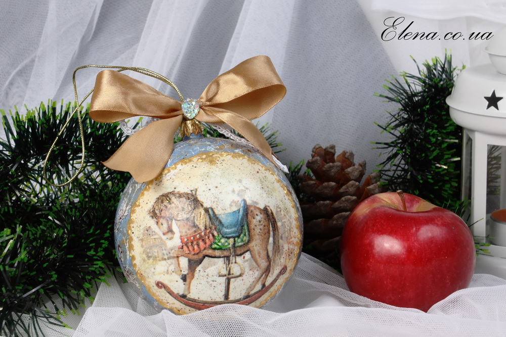 Шар сделан из небьющегося материала, декорирован в технике декупаж с элементами ручной росписи, украшен бантами.