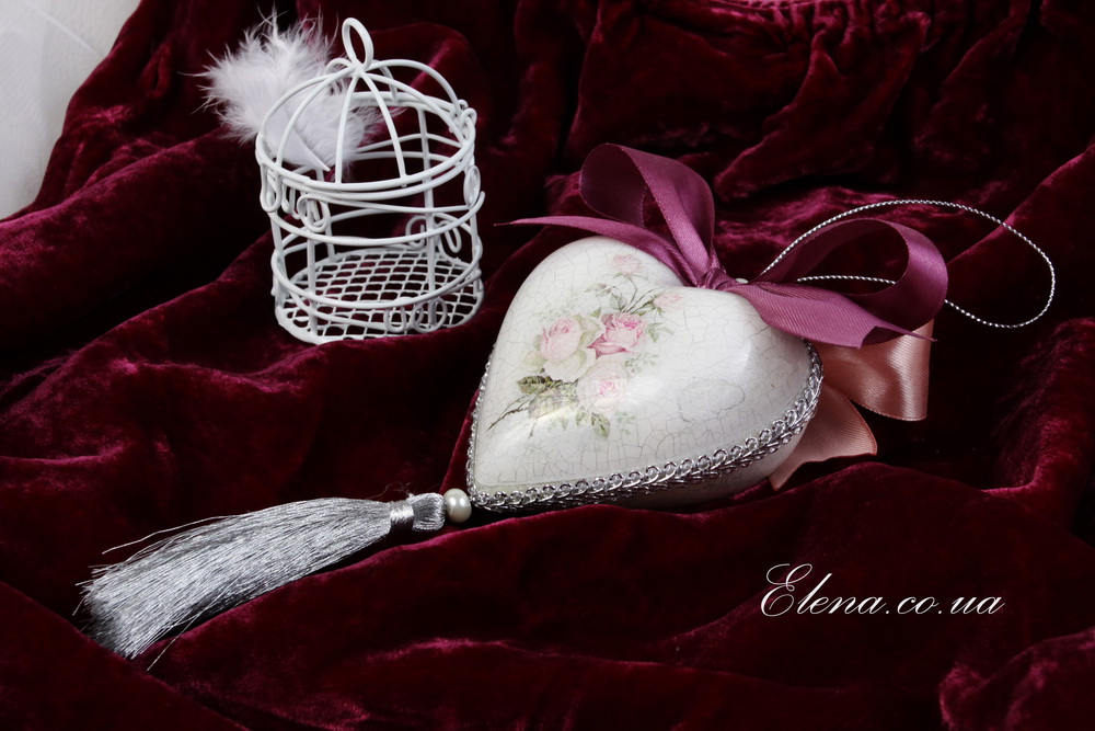 Интерьерное украшение - двухсторонняя подвеска в форме сердца, украшена кистью, тесьмой и бантами.