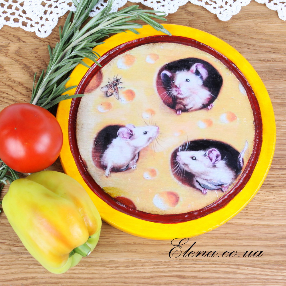Мышки и сыр созданы друг для друга! А яркая доска цветом и формой напоминает головку швейцарского сыра, от соблазна попробовать который не удержалась эта весёлая троица подружек-мышат.