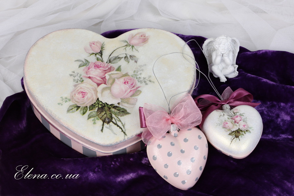Підвіски однакові, з одного боку - зображен букет троянд, з іншого - цяточки на рожевому тлі. Украшены бантиками. Короб всередині без декору, зроблен з металу, який може контактувати з харчовими продуктами.