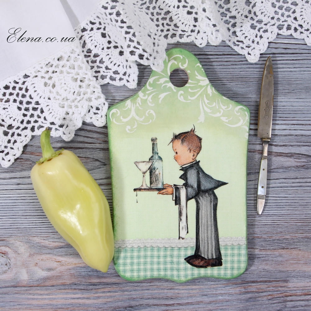 Прикрашена зображенням хлопчика-офіціанта у вінтажному стилі.