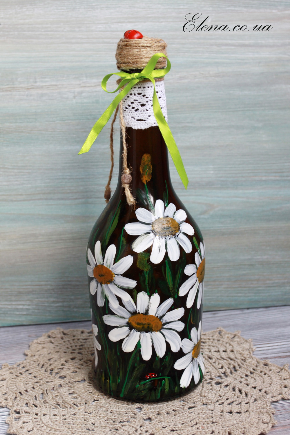 Розписана акриловими фарбами, вкрита лаком. Кришечка декорована джутом та пластиковою фігуркою, на шийці стрічки та мереживо.