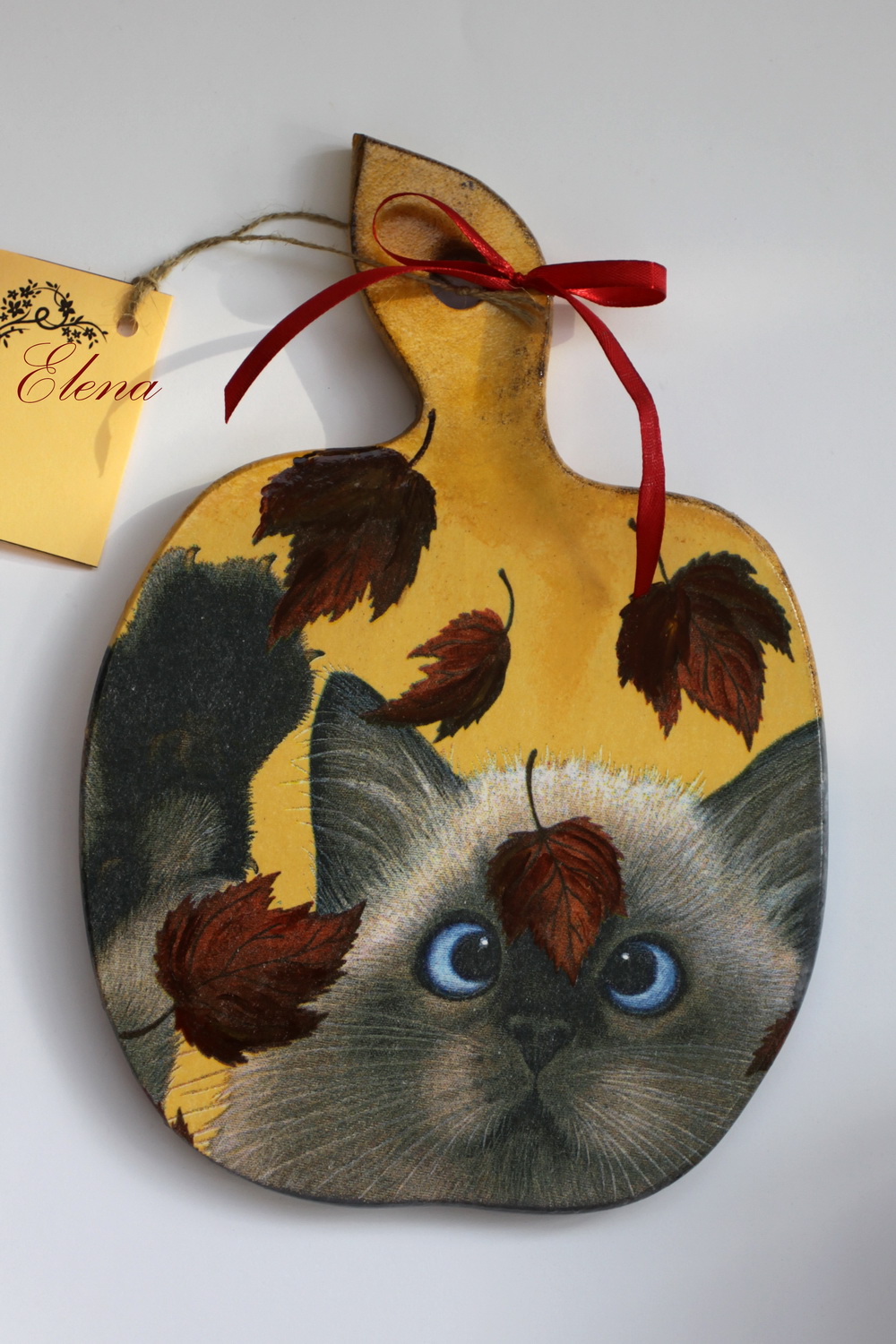 Доска с забавным котиком украсит кухню как панно и может быть использована для нарезки фруктов или овощей. В работе применены только экологичные материалы.