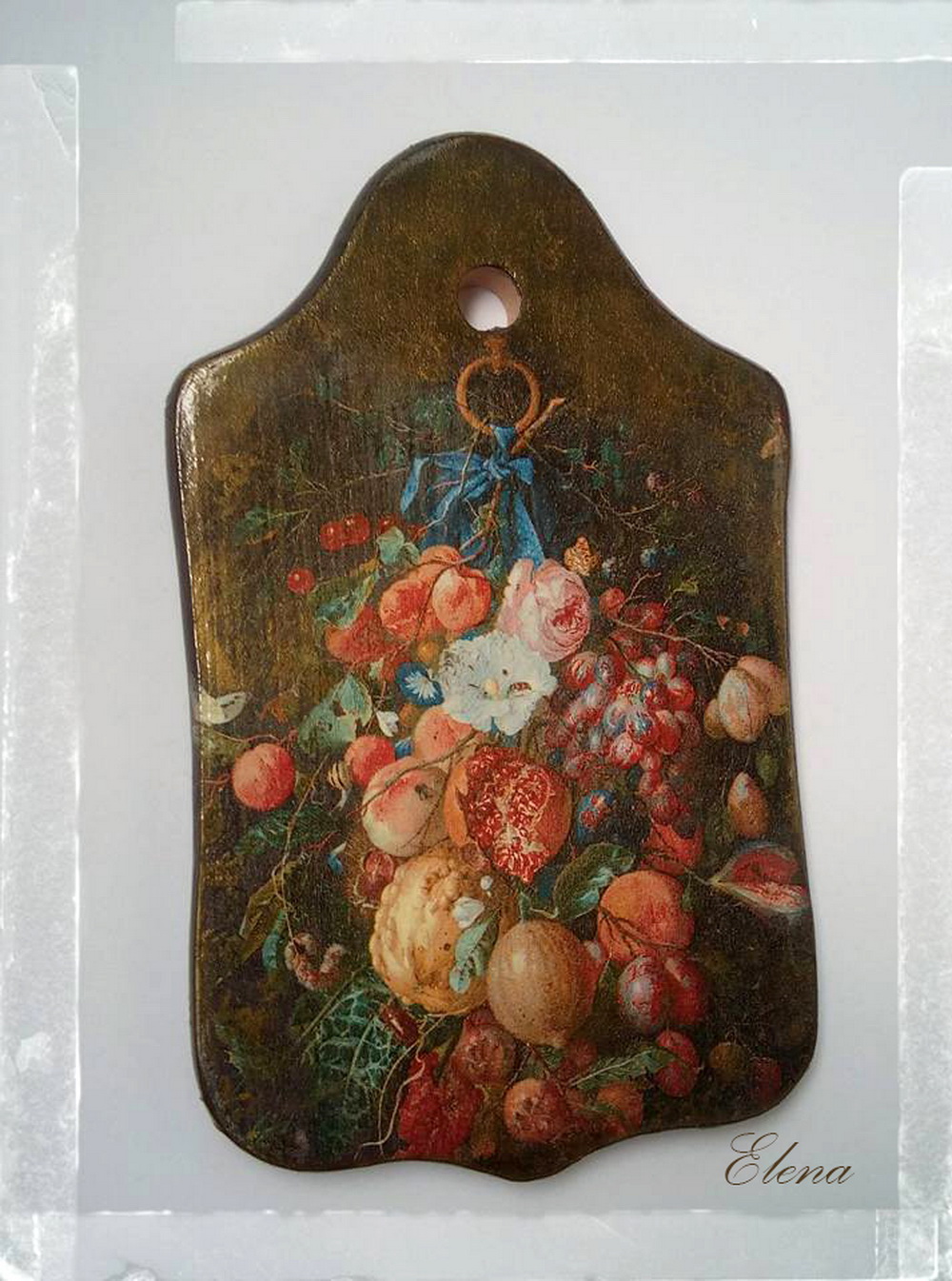 Доска с классическим натюрмортом будет выглядеть как картина на стене вашей кухни.