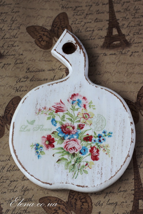 Небольшая кухонная дощечка в форме яблока с изображением букета цветов, выполнена в стиле "шебби-шик".
