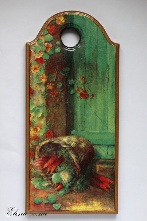 Небольшая кухонная дощечка с изображением букета нежных роз в старинной вазе.