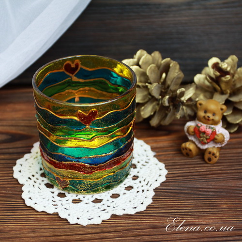 Скляний свічник з вітражним розписом, прикрашений блискітками.