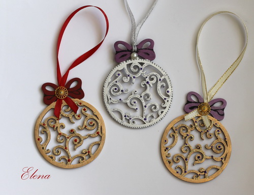 Фигурно вырезанные новогодние украшения в виде заснеженной ёлки с колокольчиком внутри.
