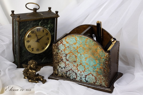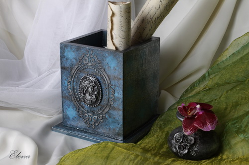 Подставка для канцелярских предметов или для расчёсок и макияжных кистей украшена накладной камеей с имитацией старинного серебра.
