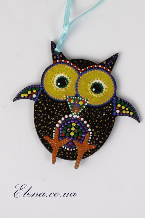 Декоративная подвеска - совушкa, украшенная разноцветными мелкими точками с одной стороны и золотистыми блестками - с другой.