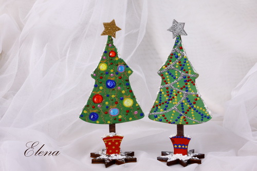 Две настольные сувенирные ёлочки, одна в серебре, другая в золоте, расписаны вручную яркими акриловыми красками.