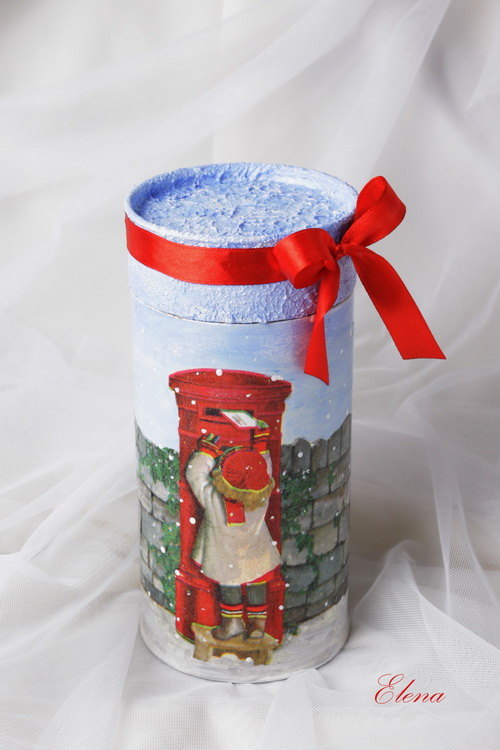 Круглая коробка с крышкой, украшена новогодней картинкой и красным бантиком.