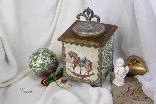 Короб в винтажном стиле хранит внутри чудесную ёлочную игрушку - шар.