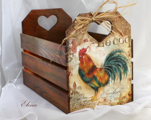 Колоритный петух, ручки-вырезы в форме сердечек, красота натурального мореного дерева - этот ящик никого не оставит равнодушным!