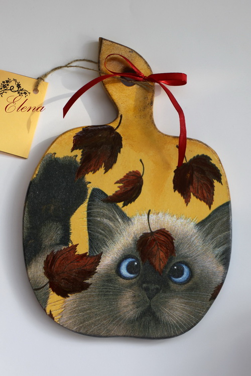 Доска с забавным котиком украсит кухню как панно и может быть использована для нарезки фруктов или овощей. В работе применены только экологичные материалы.