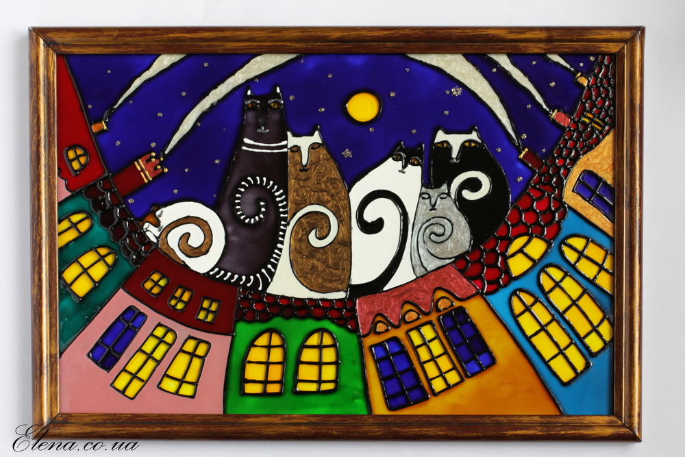 Вироблено в техніці вітражного розпису на склі за мотивами малюнка художниці Петі Константінової.