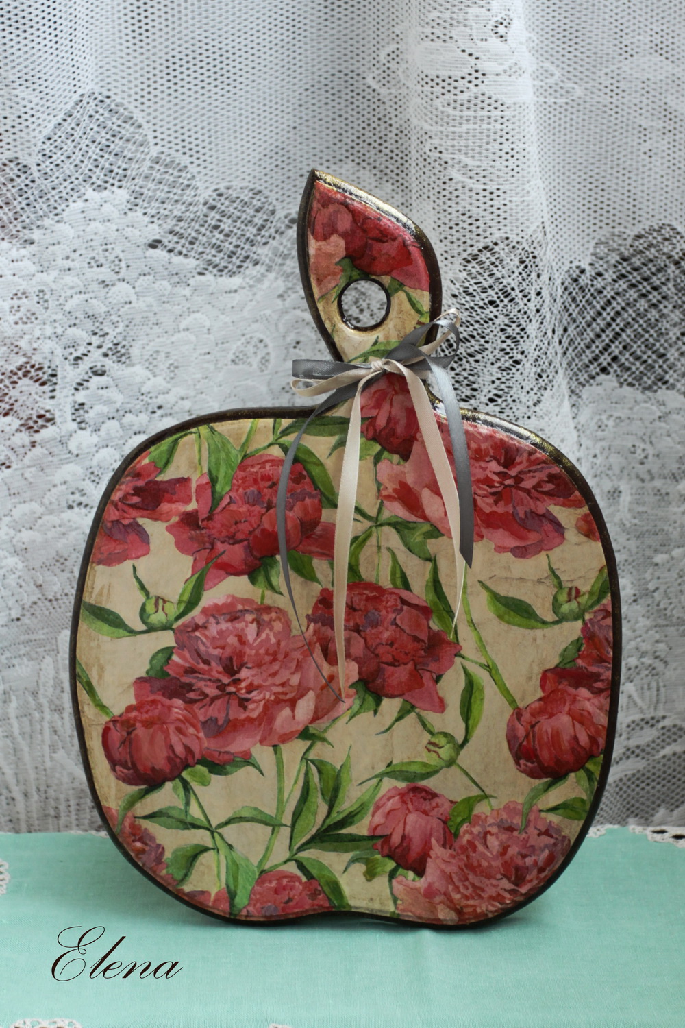 Деревянная доска в форме яблока с изображением ярких пионов может быть использована для нарезки продуктов, в остальное время будет просто украшать вашу кухню.